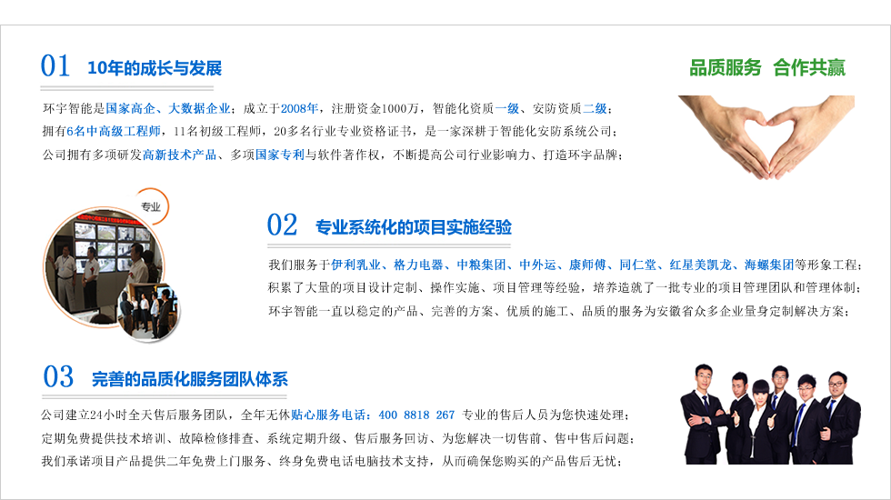 合肥市環(huán)宇智能工程有限公司成立于2008年,科創版上市企業,現注冊資金1000萬元整,電子與智能化系統集成資質壹級,安防資質貳級,是“國家高新技術企業”、“合肥市高新技術產品認定企業”、“安徽省安防協會會員單位”、“AAA級信用等級認證企業”、“AAA級重合同守信用企業”、“合肥市創新型企業”、是行業領先的智能化整體解決方案的集成商。